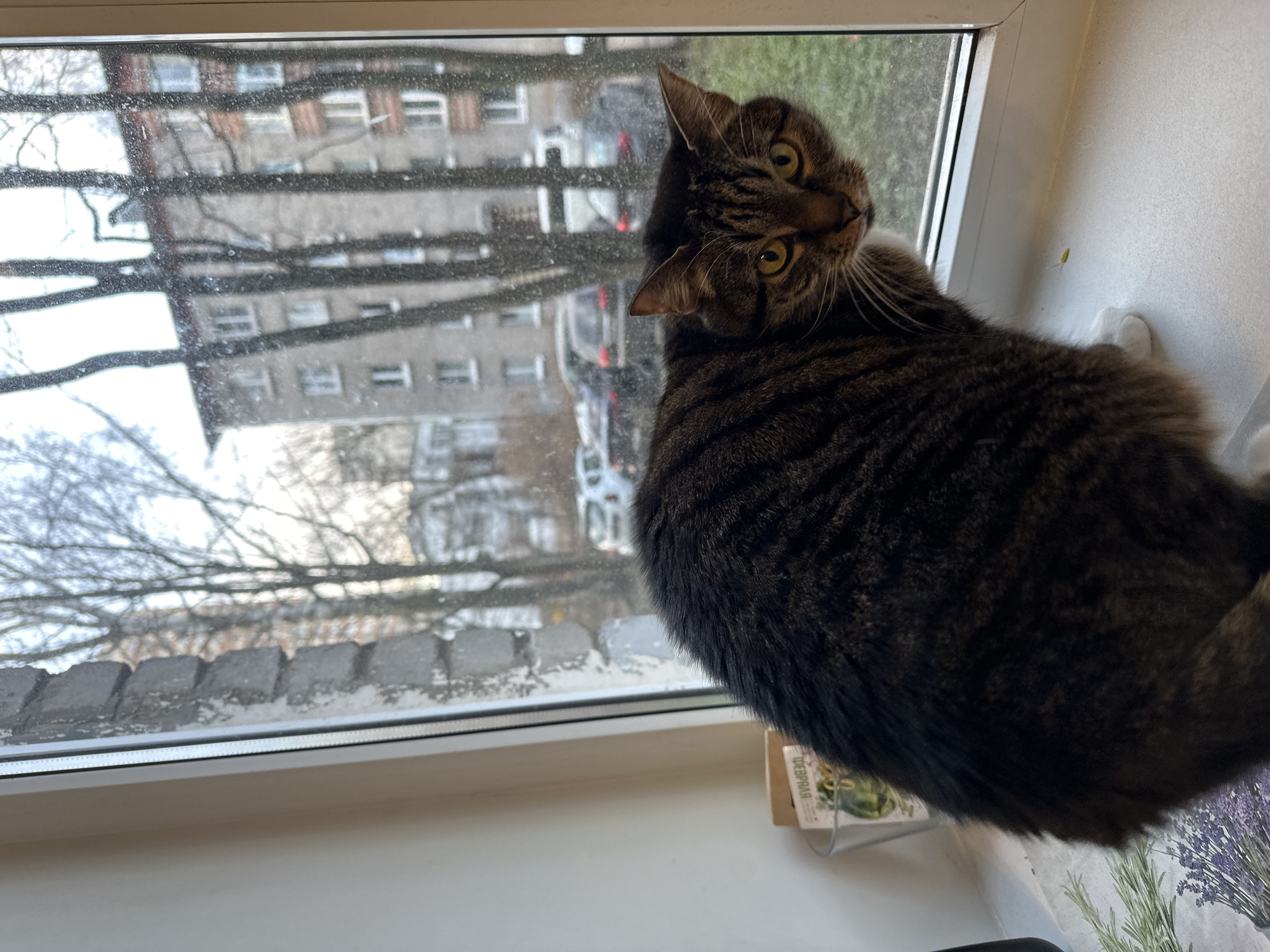 A large, domestic short-haired tabby cat with dark brown and black stripes, prominent yellow eyes, and white fur on its paws and lower chest area, sits facing forward on a white windowsill. Its body is angled slightly to the left. To the cat's left, on the windowsill, a clear container holds a small, upright paper packet displaying inverted Cyrillic text, partially obscured, resting on a patterned surface depicting lavender and rosemary. The interior wall to the left of the window is white. Through the white-framed window, which exhibits visible water spots or condensation, an exterior residential scene in Saint Petersburg, Russia, is visible. Directly across from the window stands a multi-story, light gray apartment building, characteristic of Soviet-era architecture, with numerous rectangular windows. Several bare deciduous trees with dark trunks and branches are positioned between the viewer's location and the distant building, partially obscuring the view. A street or parking area with several parked vehicles, including a white van, a dark SUV, and a dark sedan, is discernible beneath the trees. The ground beneath the distant building shows patches of green-brown grass. The sky is overcast and appears bright, suggesting daytime conditions. The exterior window frame to the left reveals a wall constructed of rough, rectangular, gray blocks.