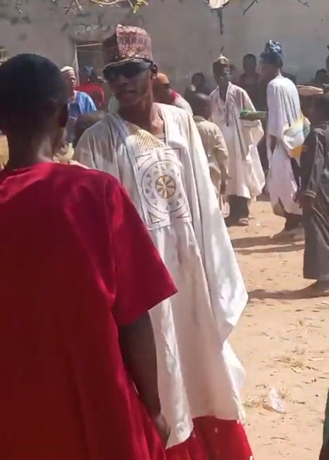 crowd of people gathered outdoors, likely in a village or small town setting. Many are wearing traditional West African clothing, including long flowing robes called boubous, and various types of hats. The ground appears to be dirt or sand. Some people are holding water bottles. The overall atmosphere seems festive, possibly a celebration or gathering. A low-resolution camera and shaky filming prevent detailed identification of individual features, though most of the people seem to be male.