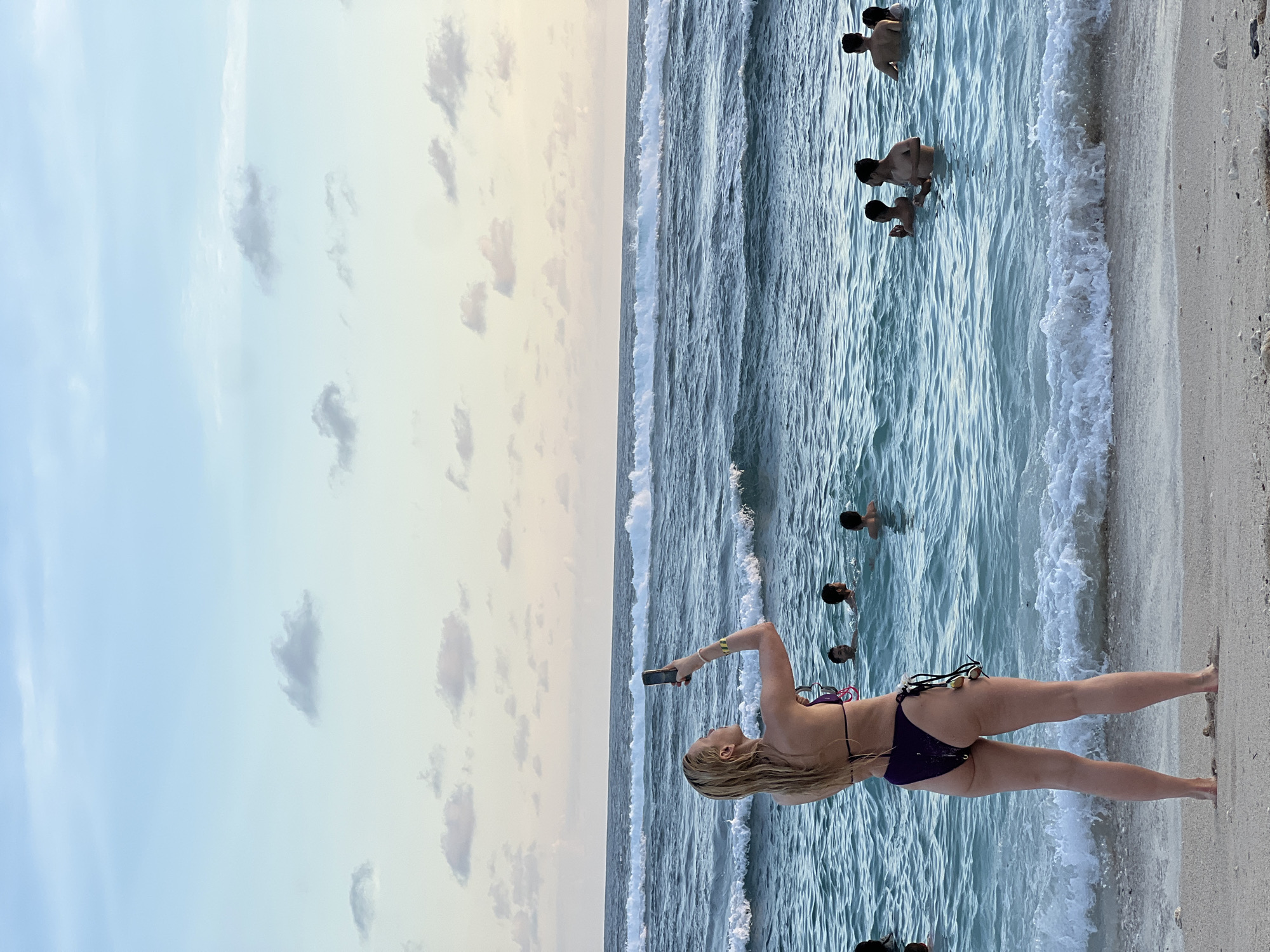 beach scene in Ungasan, Indonesia. A woman stands on the shoreline wearing a bikini and holding a mobile phone in her right hand, seemingly taking a photo. Several other people are in the water further out from the shore, some swimming and others standing. The sky is visible in the background, with clouds covering much of the sky. Waves can be seen approaching the beach.