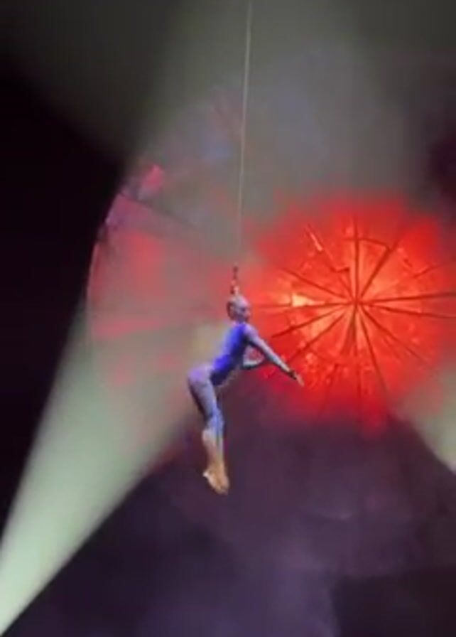 A stage aerialist, seen from the back, hangs in the air by a rope attached to her hair. She wears a blue jumpsuit. She is illuminated by spotlights, two white and one red, with theatrical smoke swirling around her. Behind her is a large, round prop colored red. Spectators sit in the foreground. She slowly rotates and poses.