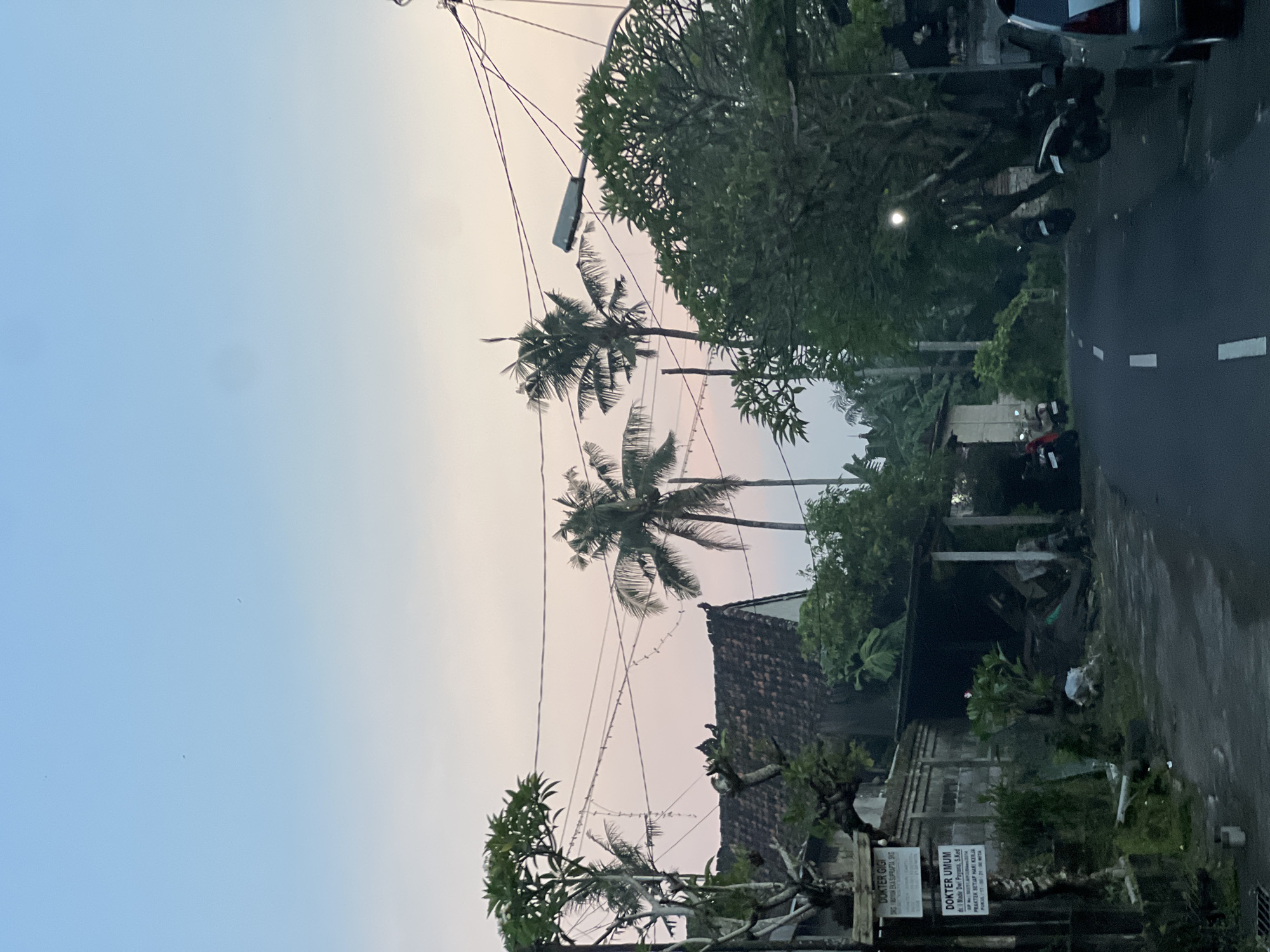 The image depicts a rural or suburban street scene in Celuk, Indonesia, at what appears to be either dawn or dusk, characterized by a sky gradient from light blue at the zenith to pale pink near the horizon