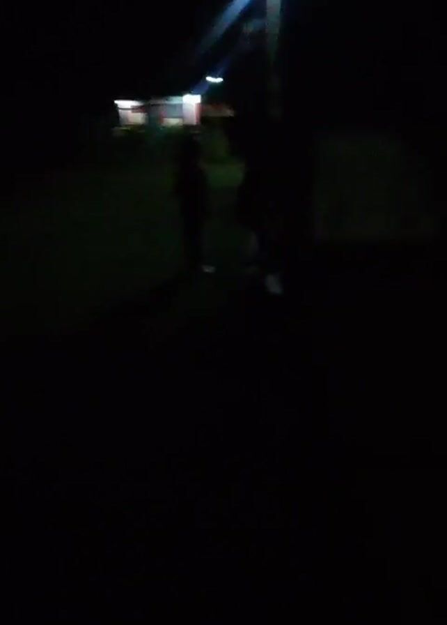 n outdoor scene at night, largely obscured by darkness. Two individuals can be seen silhouetted against the dim light in the background. They appear to be standing, and a faint light source casts a dim glow onto their lower bodies. The surroundings seem to be grassy or vegetated. The scene is very dark and unclear, making it difficult to discern further details.