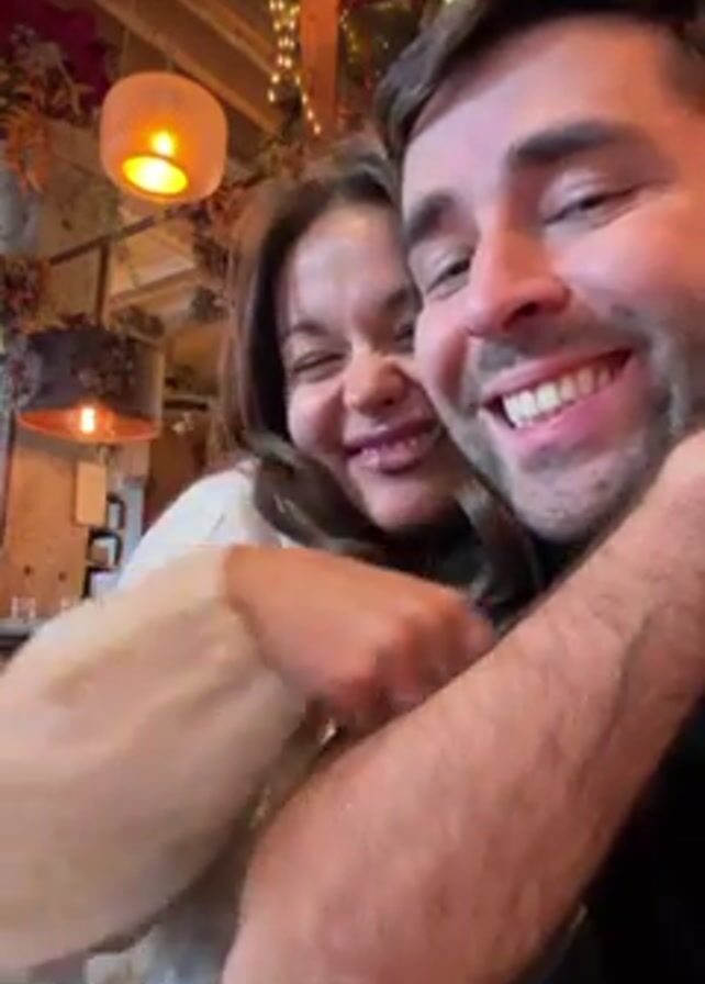 A man and woman are inside a building, with the man holding a phone camera and recording. The man embraces the woman and she embraces him back. The woman kisses the man. The woman has long brown hair and is wearing a white blouse with flower decorations. The man has short dark hair and is wearing a black shirt. The building has string lights on the ceiling and a bar is visible in the background.