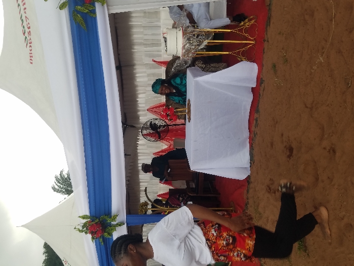 The scene depicts an outdoor event taking place under white tents in Alor, Nigeria