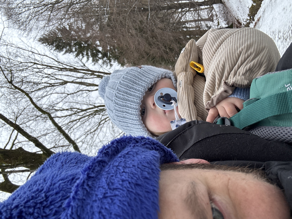 A close-up, angled shot shows a baby wearing a light blue knit hat and a pacifier, nestled against someone in a blue fleece. The baby is wearing a beige corduroy jacket and has their hand resting on a green backpack. The adult's face is partially visible at the bottom, with closed eyes. Bare trees and snow-covered ground are visible in the background, suggesting a cold, outdoor setting.