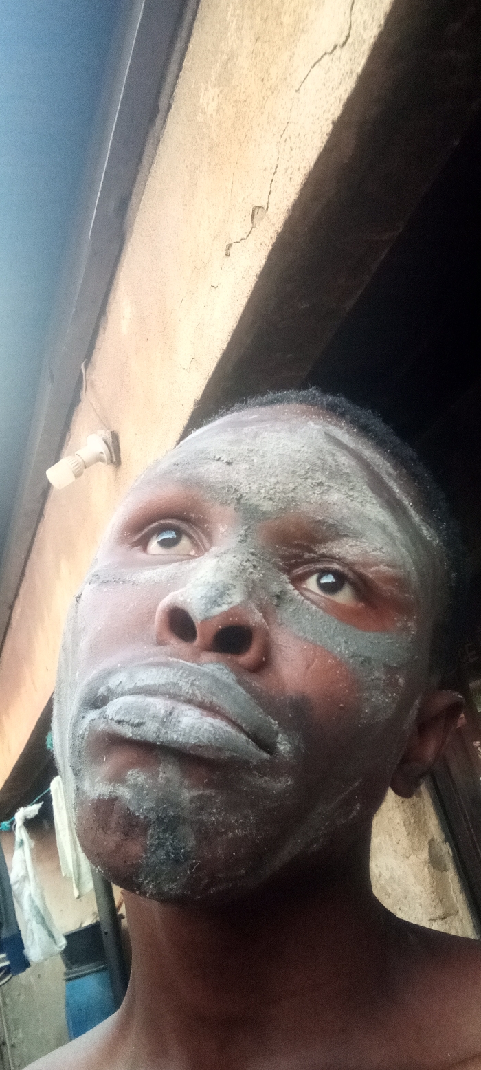 An adult male with dark skin and short dark hair is depicted in a close-up, upward-angled shot in Sabon Tasha, Nigeria. His face is largely covered with a light grey, textured substance, appearing to be a mask or ceremonial application. The substance is applied unevenly across his forehead, around his eyes, cheeks, nose, and lips, leaving parts of his natural skin tone visible, including a dark stubble on his chin and jawline. His dark eyes are open and gaze upwards and slightly to the viewer's right. No clothing is visible on his upper torso. The background consists of a light-colored, possibly concrete, wall exhibiting visible cracks. Attached to the wall in the upper left is a small, white, cylindrical fixture. Above the subject and the wall, a dark, rough-hewn wooden beam extends horizontally, casting a shadow. In the distant background, to the lower left, light-colored fabric (possibly laundry) is hanging, and a dark blue barrel or container is partially visible. The scene is illuminated by natural light, casting clear shadows, indicating daytime conditions.