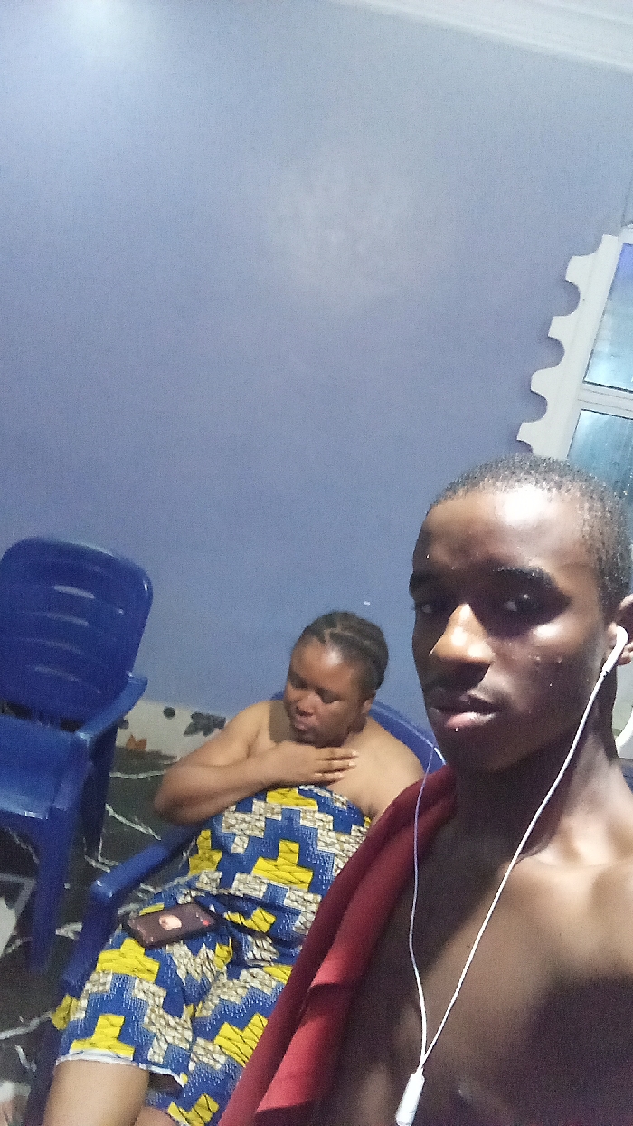 An indoor shot shows two people. A young man in the foreground faces the camera, wearing earphones and a red cloth draped over his shoulder. Behind him, a woman sits in a blue chair, wrapped in a blue and yellow patterned cloth. A smartphone rests on her lap. The background features a light blue wall with a window visible in the upper right. Another blue chair is visible to the left of the woman.