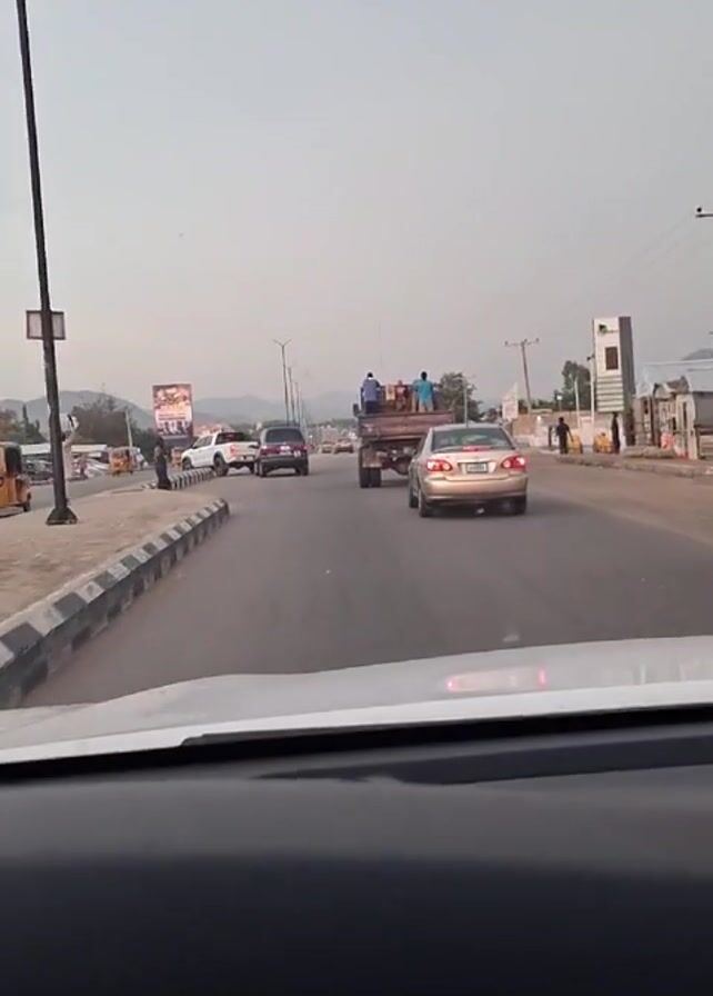 car driving down a road in what appears to be a city or town. The road has multiple lanes and there are other vehicles on it, including cars, trucks, and auto rickshaws. Several people are riding on the back of a large flat-bed truck. There are buildings and gas stations along the side of the road. The weather seems clear, and it might be dusk or dawn. The camera is positioned inside a car, looking out through the windshield.