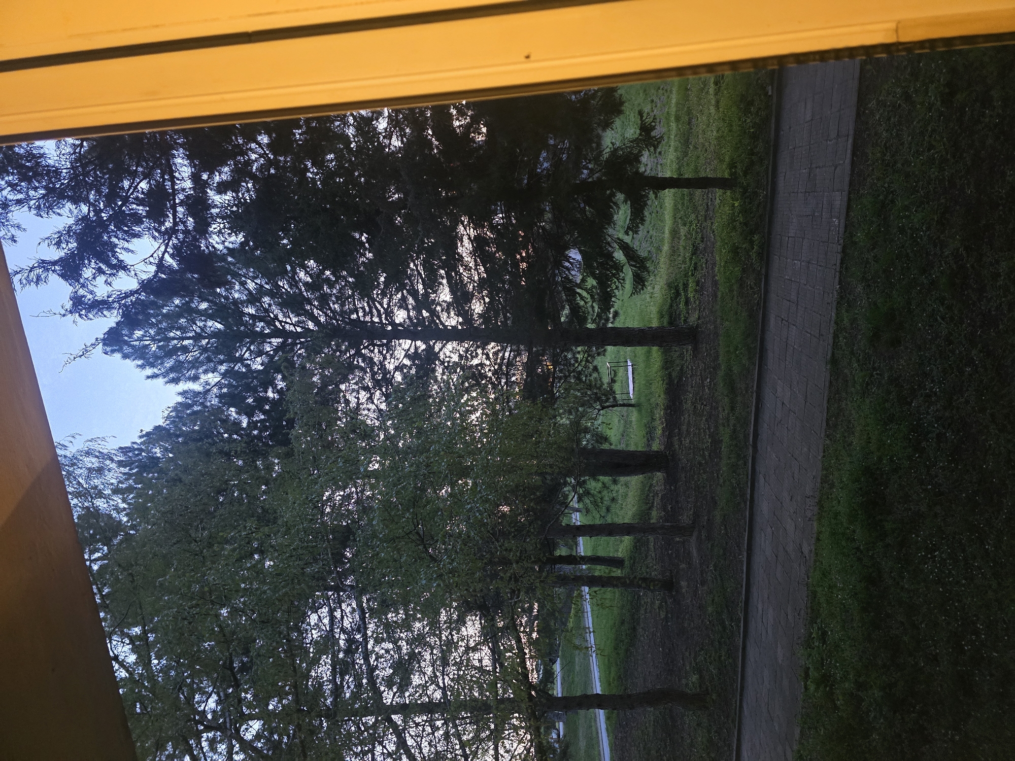 view from inside a room, framed by a window or doorway. The exterior view consists of a row of trees bordering a paved walkway. Beyond the trees is a grassy area. The sky is visible through the trees. The lighting suggests it is either early morning or late evening. The location is likely in Veliko Tarnovo, Bulgaria, given the prompt.
