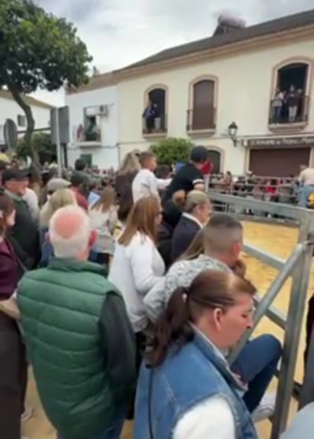 The video depicts a crowd of people gathered behind metal barriers in a public square, likely for an event. Individuals of varying ages and attire are visible, many looking towards a sandy area within the square. Some people are standing, while others are seated on the barriers. The buildings surrounding the square are two stories high, with white facades and balconies where additional spectators are watching. The weather appears overcast. There is a tree on the left and shop signs are visible in the background, further suggesting a town square location.