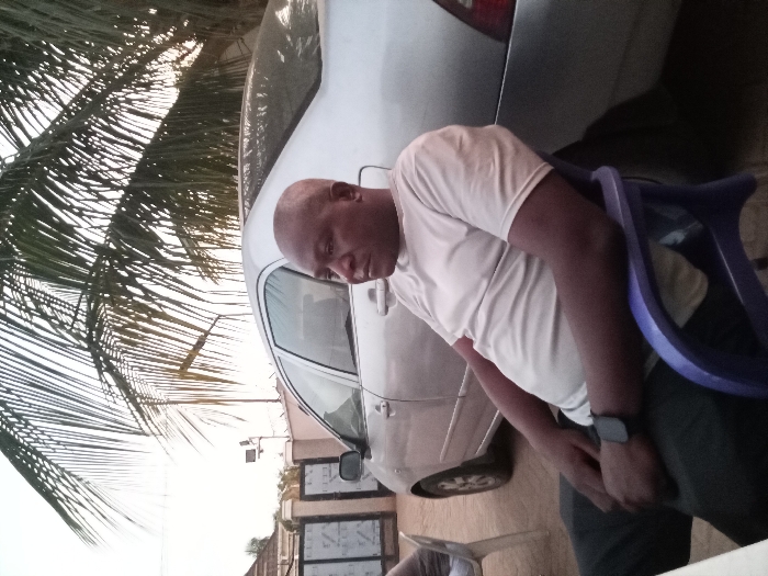 An outdoor scene in Barden Yana, Nigeria, is depicted, likely during late afternoon or early evening. In the foreground, a dark-complexioned adult male, bald, is seated in a purple plastic chair, facing the left side of the frame with a neutral expression. He wears a light-colored short-sleeved t-shirt and dark trousers, with a black smartwatch visible on his left wrist. Directly behind him is a silver sedan car, parked facing left, showing dust accumulation on its exterior. To the far left, a portion of another individual's leg and a white plastic chair are partially visible. A white surface, possibly a table, occupies the bottom-left corner. The background features a light-colored fence topped with razor wire, a metal gate, and a pole-mounted light fixture. The upper frame is filled with numerous palm fronds. The ground surface is unpaved.