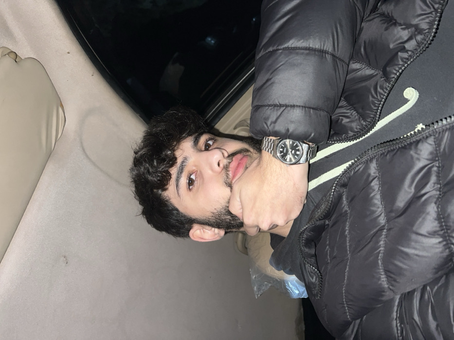 A young man with dark curly hair and a beard is the main subject. He is wearing a black puffer jacket and a silver watch. His right hand is raised to his face, supporting his chin. The background suggests he is in a car, as part of the car's interior is visible. The lighting is dim, casting shadows and adding depth to the image.