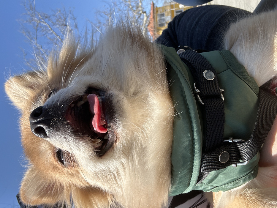 A light brown and white fluffy dog, likely a Pomeranian, is depicted in a close-up shot, held by an unseen individual. The dog is positioned looking upwards, its mouth open with its tongue partially extended, suggesting panting or excitement. It wears a dark green padded harness or jacket featuring black nylon straps and silver-toned metal buckles/snaps. The fur around its face and neck is ruffled. The background reveals a clear blue sky, bare tree branches, and a distant two-story building with an orange-tiled roof and a light yellow facade. The scene is illuminated by bright sunlight. This event occurs in the city of Varshets, Bulgaria.