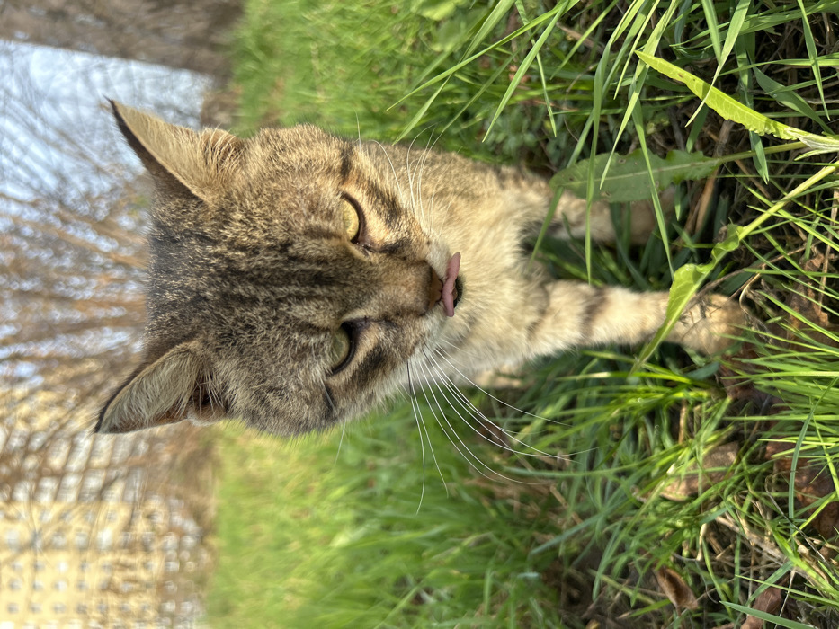 - "A tabby cat lies in green grass, sticking its tongue out slightly" by FM-kJsX23, licensed under CC BY 4.0