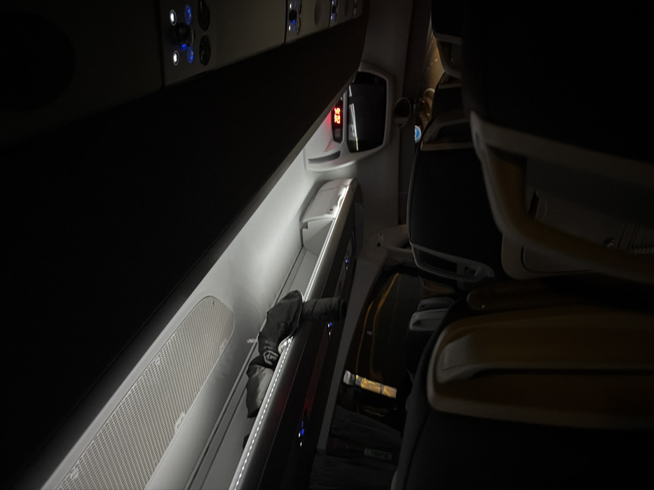 An airplane cabin interior, illuminated by dim, ambient light. The image features a dark overhead compartment panel with illuminated controls and a screen displaying the time. Below, a storage area is visible, containing a dark jacket. In the foreground, a partially visible airplane seat shows armrests with wood-like trim and dark upholstery. The scene creates an intimate and enclosed atmosphere of air travel.