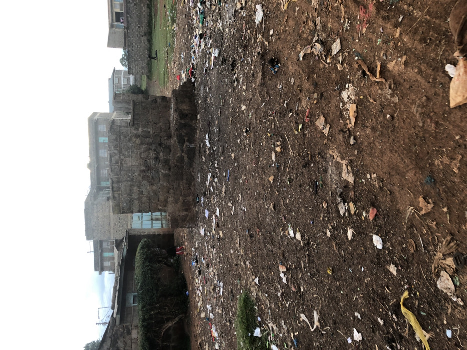 A neglected landscape shows a field covered in scattered trash. A tall stone building stands to the left, near a green bush. The sky is overcast. In the background, more buildings are visible above the stone structure. The ground is brown and bare, marked by the extensive litter.