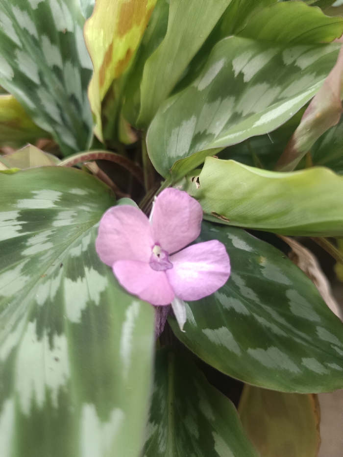 A close-up, top-down view depicts a plant with a single, four-petaled flower, pink to light purple in color, centrally located with a darker purple stigma. The flower is positioned slightly below the image's vertical center. Surrounding the blossom are multiple broad, ovate leaves characterized by a dark green base color and distinct lighter green or silvery-white variegation in a patterned formation. Some leaves exhibit minor browning or yellowing along their edges, and one leaf displays small holes. Dark reddish-brown leaf stems are partially visible at the base of the foliage. The background is composed of out-of-focus green leaves of the same plant. The scene is located in Ouderkerk aan de Amstel, Netherlands.