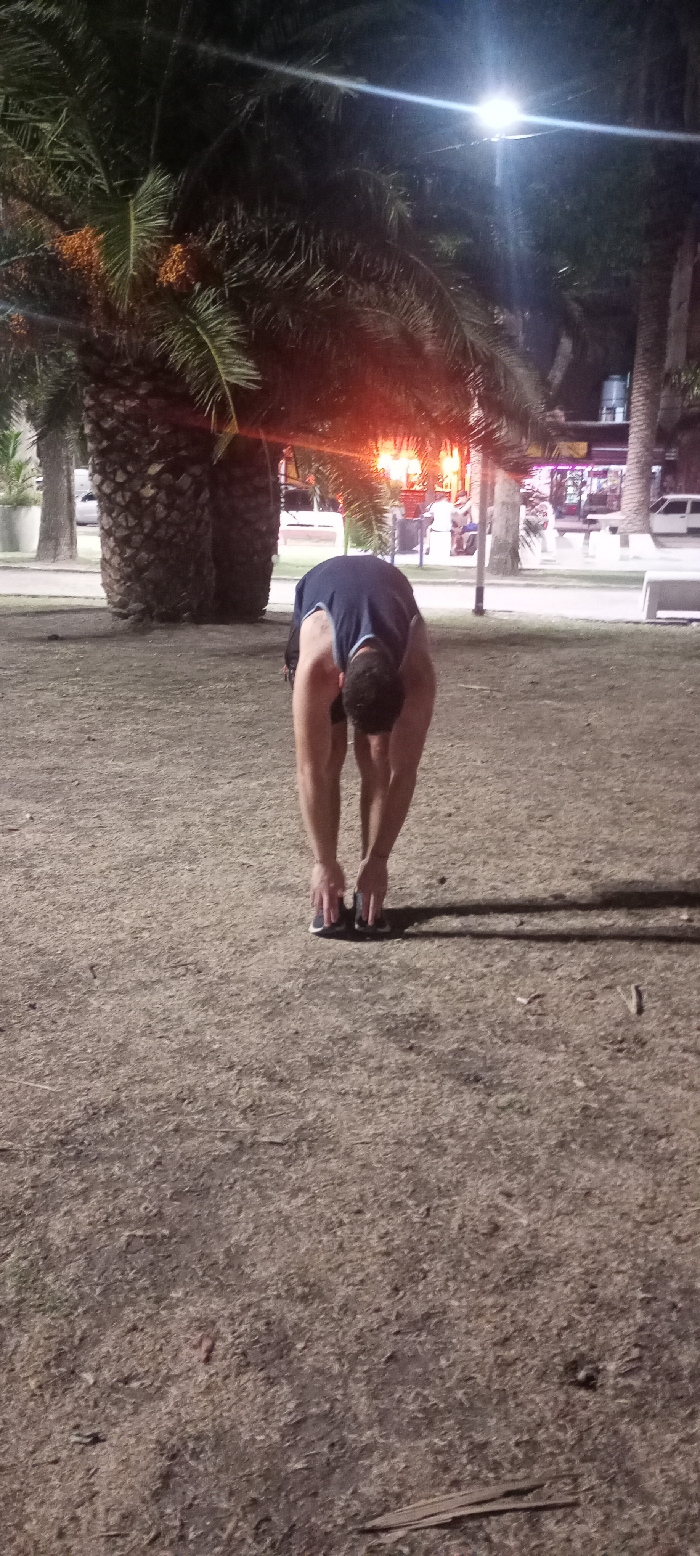 A man stretches on a grassy field at night. He is bent over, reaching for his toes, wearing a dark tank top and shorts. Behind him are large palm trees and street lights. In the background, faint lights and buildings suggest a nearby town or city. A bench and a few other people are visible further in the background, along with a parked car. The ground is dimly lit.