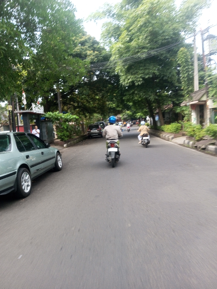 The image depicts a daytime street scene in Phonsavan, Laos. An asphalt road dominates the foreground and extends into the background. On the left side of the road, a light green four-door sedan is parked, facing away from the viewer. Further along the left, a dark sport utility vehicle is visible parked near a sidewalk area. A person wearing a white shirt stands on the sidewalk next to a roadside structure featuring a flag. The right side of the road is bordered by a concrete curb and a narrow paved strip, beyond which dense green trees and foliage line the street. Utility poles with overhead wires are visible through the tree canopy. In the midground, two motorcycles are traveling away from the viewer. The lead motorcycle's rider wears a patterned light-colored shirt and a light-colored helmet. The motorcycle closer to the viewer has a rider wearing a light-colored jacket and a blue helmet. Multiple other motorcycles are discernible in the distant background traffic. The sky above is overcast.