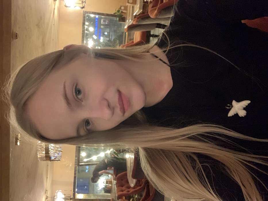 A selfie-style portrait captures a young, light-skinned female with long, straight blonde hair and blue eyes, directly facing the camera with a slight smile