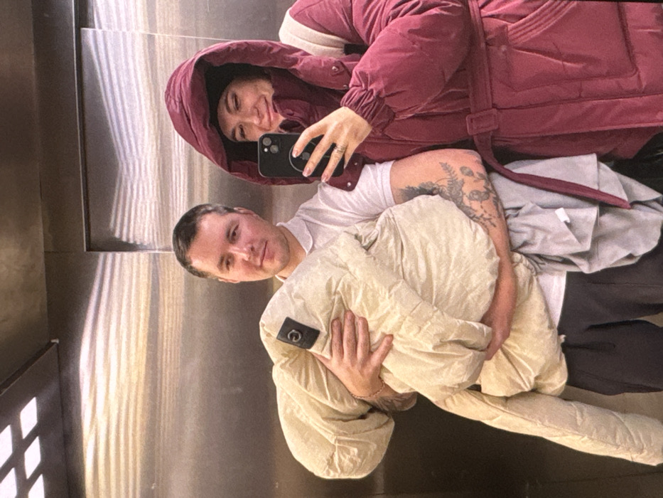 Inside an elevator in Красный Маяк, Russia, a mirror selfie depicts two individuals. A male, positioned on the left, has short dark hair, wears a white polo shirt and dark trousers. He holds a bundled light beige puffer jacket in his left arm and additional grey fabric in his right. Tattoos are visible on his right forearm. A female, on the right, wears a dark red hooded puffer coat with the hood up, a dark beanie, and a ring on her left ring finger. She holds a dark smartphone, likely an iPhone, with which she is capturing the image. Both individuals are looking towards the camera with faint smiles. The elevator interior features brushed metallic walls and square overhead lights.