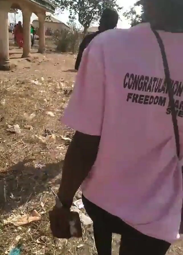 several people walking down a dirt road. The camera follows a person wearing a pink t-shirt with the words "CONGRATULATION ON UR FREEDOM PARTY SMEBA" printed on the back. Next to the person in the pink shirt is a boy with a white shirt and camouflage shorts. In the distance, there is a large group of people standing around. The ground is covered in dry grass and debris. There are trees and buildings visible in the background.
