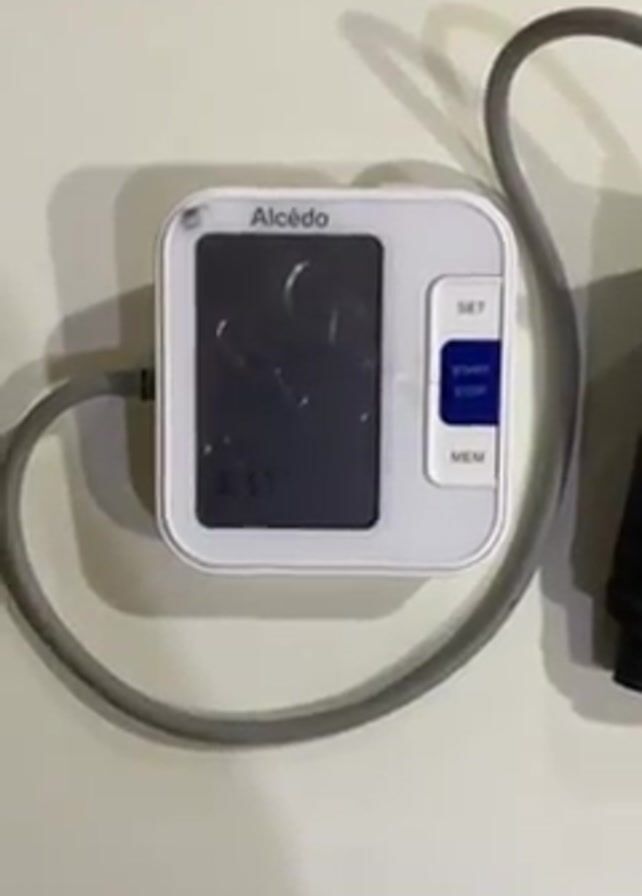 white Alcédo brand blood pressure monitor on a white surface with a connected gray tube leading to a black cuff