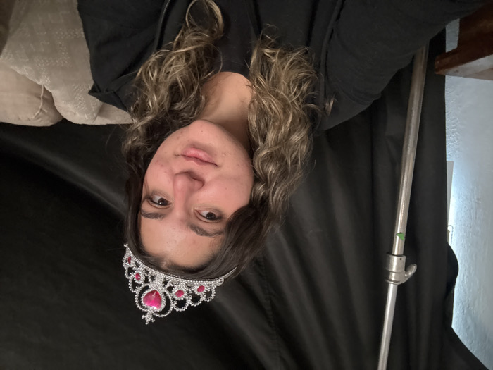 A woman with curly, highlighted hair and fair skin wears a pink and silver tiara. She is looking at the camera with a serious expression. She is wearing a dark hooded sweatshirt. Behind her is a black backdrop and a silver pole with a green marker. Part of a beige pillow is visible in the upper left corner and a shelf in the upper right.