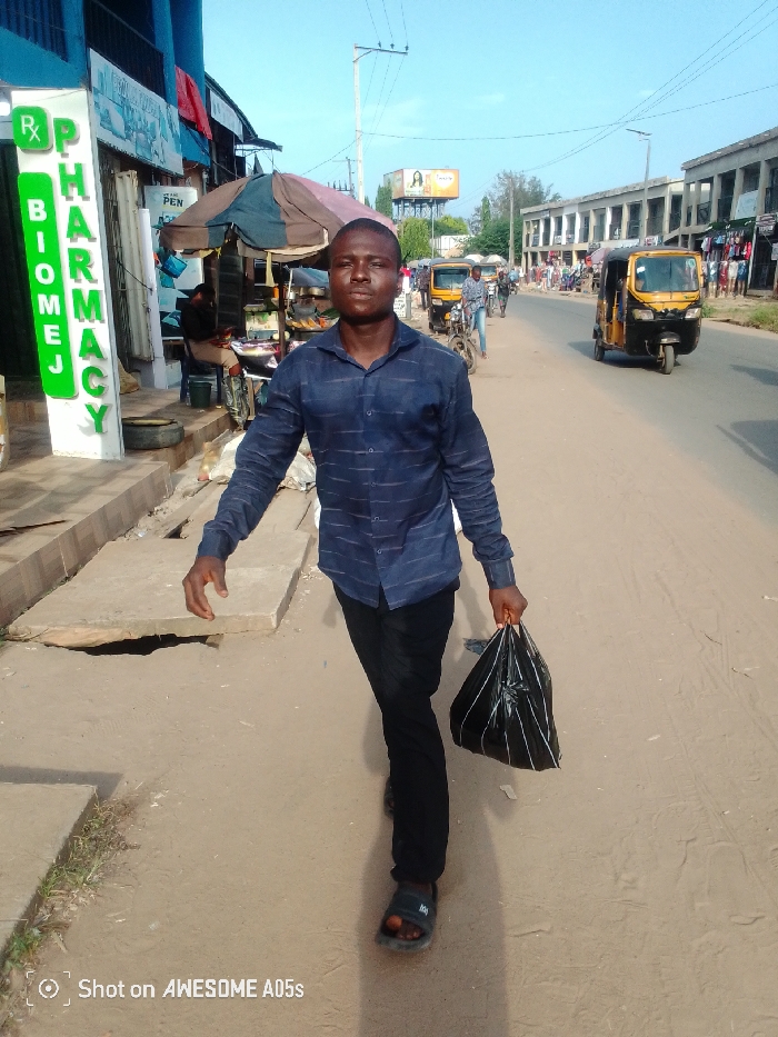 - "A daytime street scene in Egbagu, Nigeria, features a young adult male in a dark blue long-sleeved striped shirt, black trousers, and dark sandals, walking forward and slightly to the right of the frame" by FM-libCE3, licensed under CC BY 4.0