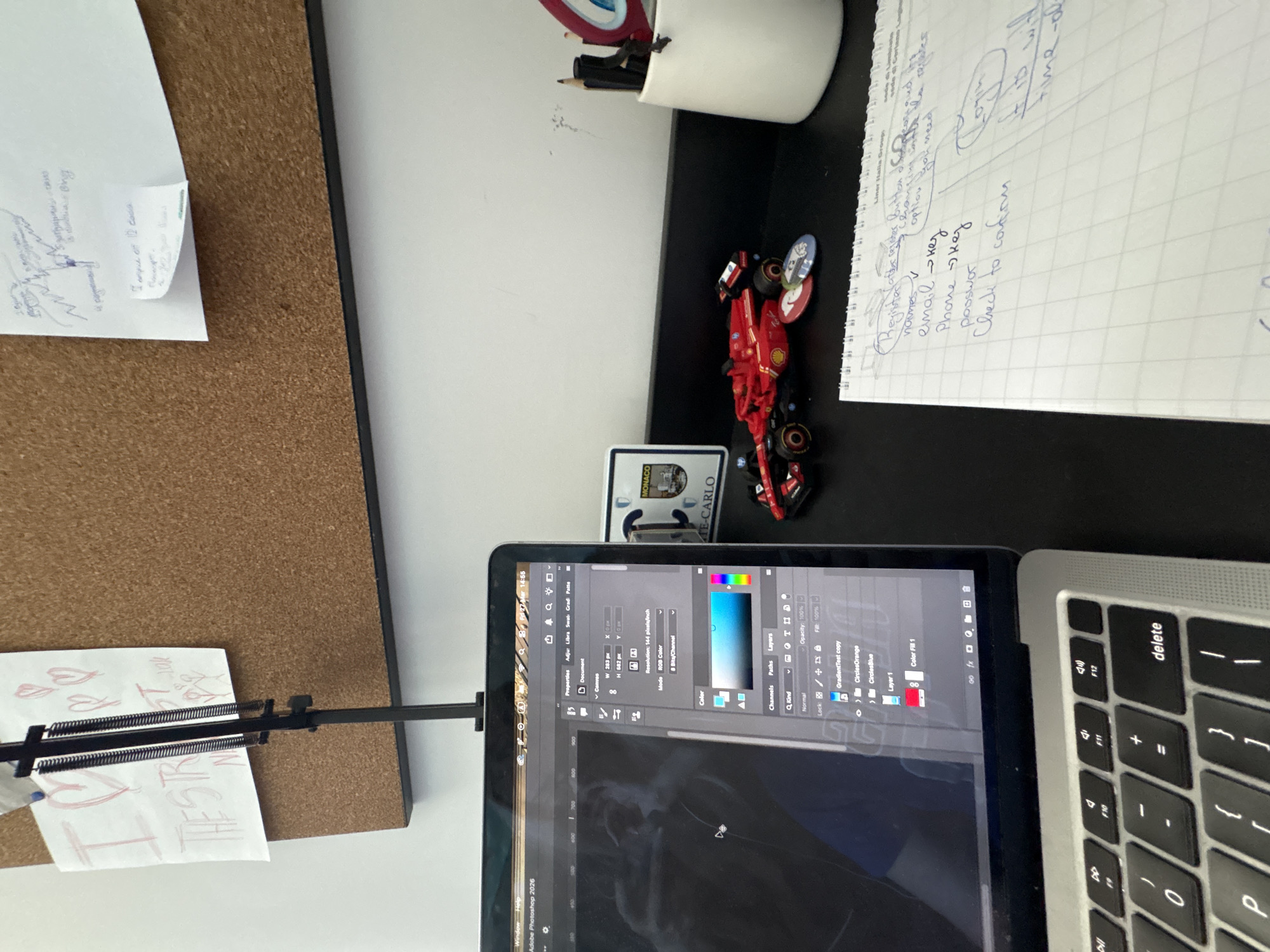 The scene depicts a static workspace in Novate Milanese, Italy. A silver MacBook Pro laptop is open on a black desk surface, displaying Adobe Photoshop 2026. The Photoshop interface shows a canvas, layer panels, and a color picker with a blue hue selected. A faint reflection is visible on the laptop screen. To the right of the laptop, a white rectangular plaque bearing the text "MONACO" and "TE-CARLO" with a crest is present. Adjacent to it, a red Formula 1-style model race car is positioned. Three colored round tokens—one red, one blue, and one with a graphic design—are situated near the car. A white cylindrical container holds multiple pencils and a red clip-like object. A spiral-bound notebook with grid paper contains handwritten notes in blue ink, detailing elements such as "Register," "names," "email," "phone," "password," "Check to confirm," and "Login." In the background, a corkboard with a black frame is mounted on a white wall. Pinned to the corkboard are several sheets of paper: one white sheet displays red handwritten text, partially visible as "I LOVE THE STRE..." accompanied by red heart drawings. Another white sheet, to the upper right, features blue handwritten graphs or diagrams. A smaller white note is partially visible below it, with text "I engage at 12 causa...". A black, adjustable stand with springs extends upwards from the desk, partially obscuring the lower left pinned note on the corkboard. No individuals are visible in the image.