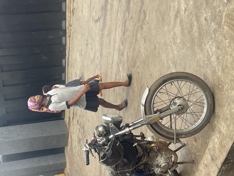 A girl with a colorful headscarf, gray shirt, and black skirt walks past a parked motorcycle with a single front wheel. Another person is slightly behind her. The ground is a light-colored concrete, and a dark gray or black wall is visible on the left. The motorcycle appears old and possibly in need of repair.
