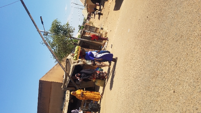 This image captures a street scene in Jos, Nigeria, under a bright, clear blue sky