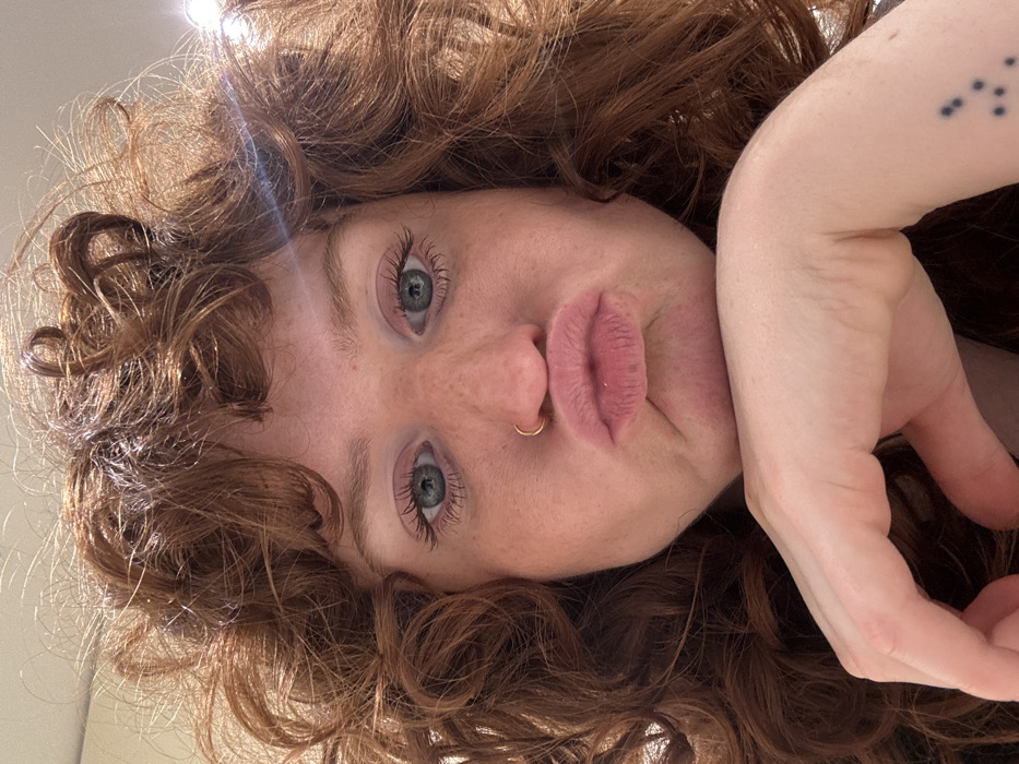 The image presents a close-up, high-angle portrait of an individual with fair skin, displaying scattered freckles across the nose and cheeks. The subject has prominent, reddish-brown, curly hair that frames the face. Their blue-grey eyes are open and directed towards the viewer. The nose features a small, golden hoop piercing on the left nostril. The subject's lips are pursed in a deliberate pouting expression. The left hand is positioned beneath the chin, supporting the jawline. A small tattoo, consisting of approximately six dark dots arranged in a constellation-like pattern, is visible on the inner wrist of the left arm. The background is brightly lit, indistinct, and out of focus, suggesting an indoor environment. The precise location, including the city of Paris, France, cannot be determined from the visual content of this image.