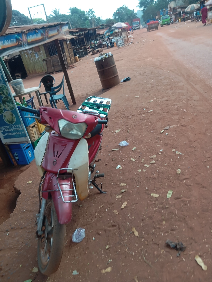 The scene depicts a rural or semi-urban roadside market area in Okpatu-Ukehe, Nigeria, under an overcast sky. In the immediate foreground, a red and beige scooter with a front metal rack and a rear green and white luggage rack is parked facing slightly right on a red-brown dirt verge. To the left of the scooter, a blue plastic crate is visible, along with a white plastic table holding a translucent container and a green bottle. Two plastic chairs, one blue and one black, are positioned around the table. A vertical sign with text and images, partially reading "CHIMDALU," stands nearby. The ground is consistently red-brown dirt, littered with scattered dry leaves, plastic debris, and visible footprints. In the midground, running parallel to the left side of the dirt road, is a row of informal market stalls constructed with wooden frames and corrugated metal roofs. One stall displays a sign reading "TURU UGO LOTA." An old, rusty metal barrel, partially filled with refuse, stands on the dirt verge next to a sign labeled "P.O.S." The unpaved red-brown dirt road extends into the distance, showing tire tracks. Multiple vehicles are observed on the road, including a green small truck, a lighter-colored larger truck, and a red vehicle, all moving away from the viewer. Several individuals are present on or near the road; one person in a dark red garment is walking on the far right side, moving away. The background consists of dense green foliage, and overhead power lines are visible against the hazy sky.