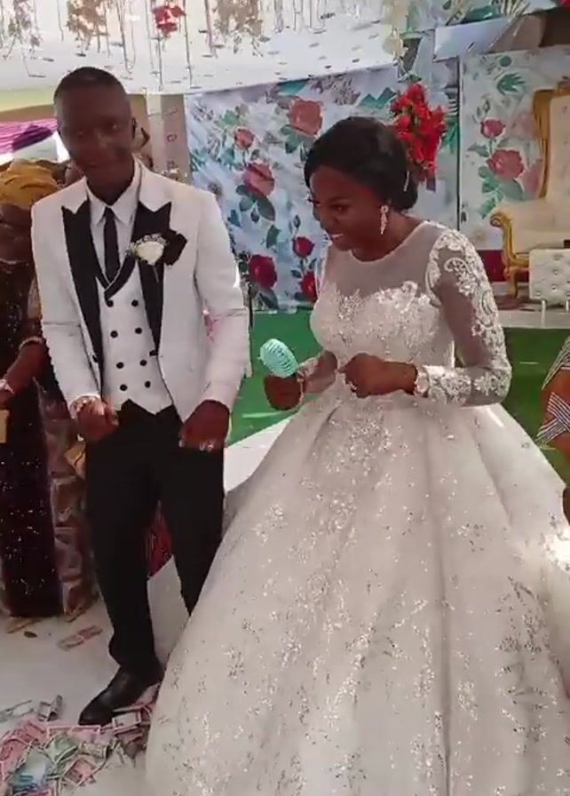 bride and groom dancing at their wedding. The groom is wearing a white tuxedo jacket with black lapels, a black vest, black pants, and black shoes. The bride is wearing a white, long-sleeved ballgown with sparkly embellishments. Money litters the floor. Behind the bride and groom are two women wearing traditional Nigerian clothing, and other guests can be seen in the background. The wedding appears to be taking place outdoors under a tent-like structure decorated with flowers and streamers.