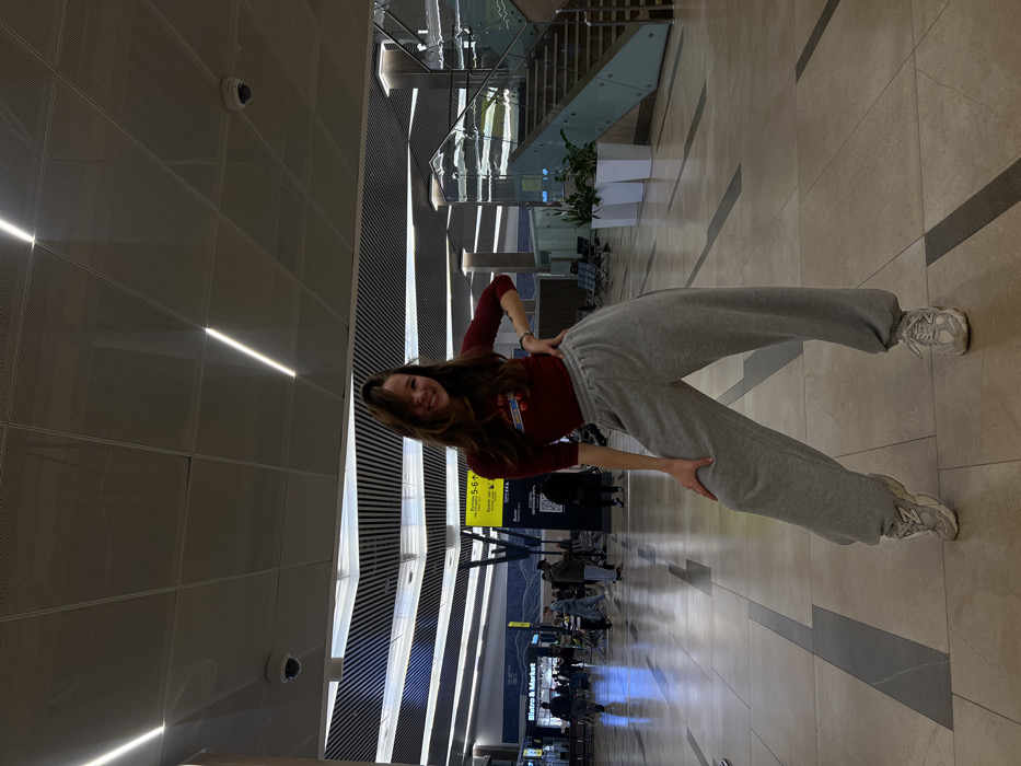 The image displays a young female posing in a large, modern indoor public space located in the city of Sukhaya, Russia
