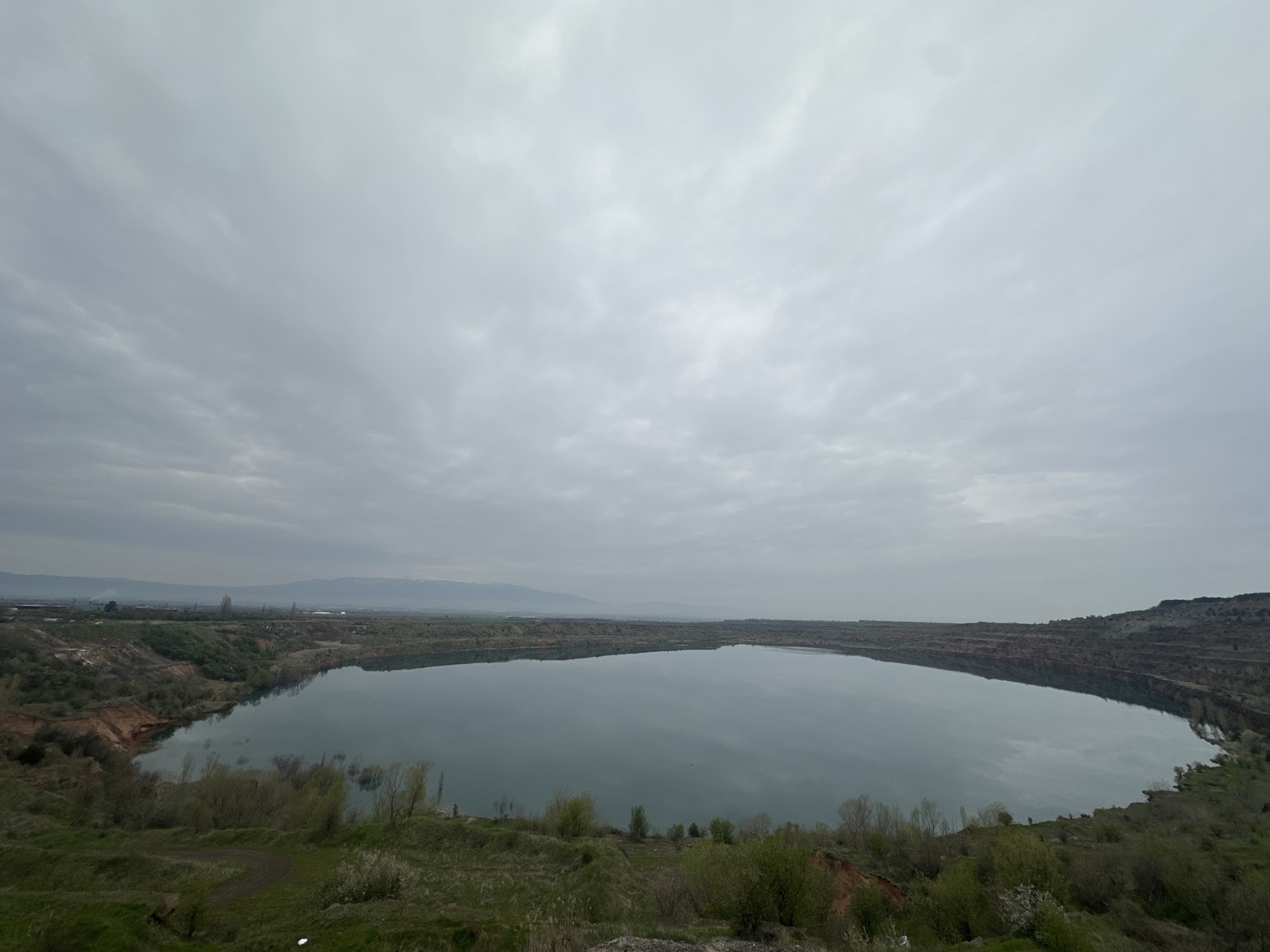 The image depicts a lake or reservoir surrounded by an eroded landscape, likely the result of quarrying or mining activities. The water surface is relatively still, reflecting the overcast sky. The surrounding terrain shows signs of disturbance, with exposed soil and vegetation struggling to establish itself. In the distance, a faint mountain range is visible on the horizon. Based on prior context, this is likely near Sofia, Bulgaria. Buildings and industrial infrastructure can be seen in the background on the left, indicating the proximity of urban or industrial areas. The environment is somewhat barren and industrial. There are no visible people, interactions, or actions occurring in the image.