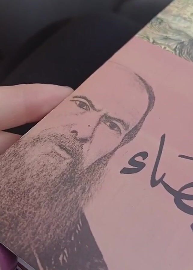 A hand holds a book with a drawing of a man with a long beard on a pink cover. The man's face, including his eye and a mole on his nose, is zoomed in on. The book also has text written in Arabic. The background is out of focus and appears to be a black surface.