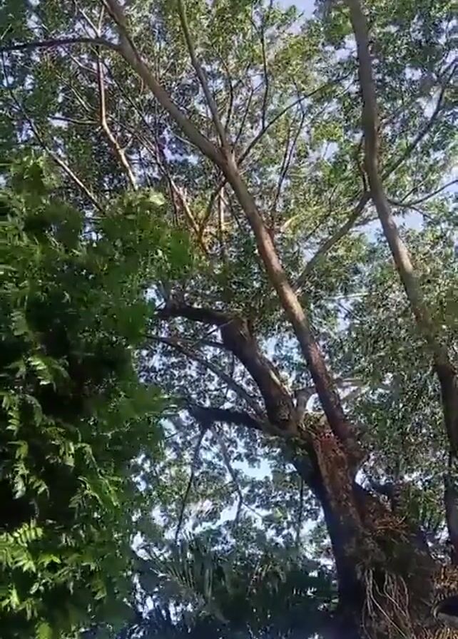 The camera looks up at a large tree with dense green foliage. The trunk is thick and partially obscured by other plants growing on it. The sky is visible through the canopy, with patches of light blue. The overall impression is that the tree is in a natural, possibly tropical, environment.