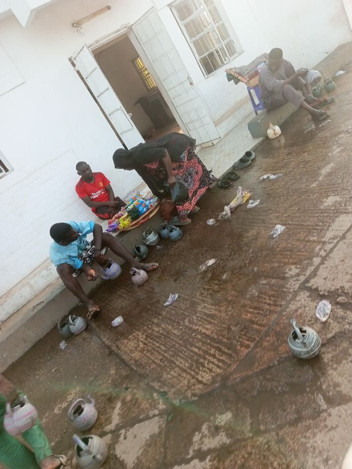 Outside a white building, four individuals are visible. One person, dressed in red, is seated with a tray of colorful items nearby. Another person wearing blue is kneeling and handling a small pot. An adult in dark clothing bends over, seemingly interacting with the pots. A seated individual in the upper right appears to be observing the activity. Several small pots are scattered on the wet, concrete floor, along with scattered debris.
