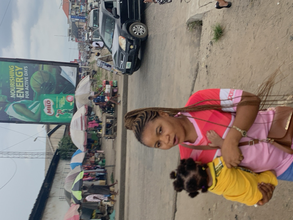 This image depicts a bustling urban street scene in Aba, Abia, Nigeria. In the immediate foreground, a woman, appearing to be in her twenties or thirties, stands holding a small child. The woman has light brown skin, her hair is styled in long, intricate cornrow braids pulled into a high ponytail, and she wears a pink and red short-sleeved shirt with blue jeans. A brown shoulder bag is slung across her body. She looks directly towards the viewer with her mouth slightly open. The child she holds is clad in a yellow shirt, with their back to the camera, revealing dark hair styled in multiple small buns or knots. Behind them, a paved road stretches diagonally, showing active traffic. A black SUV, possibly a Honda CR-V, is visible moving right-to-left in the mid-ground. Along the opposite side of the road, a vibrant market scene unfolds with numerous vendor stalls shaded by various large umbrellas in colors such as white, blue, green, and striped patterns. People are seen walking and standing among these stalls, indicating commerce. Further down the road, more vehicles and distant structures are visible under a light, overcast sky. A prominent feature in the background is a large billboard advertising "MILO" (Nestlé), displaying text that reads "NOURISHING ENERGY FOR ACTIVE DAYS" alongside an image related to sports. A tall metal mast is also present in the distance. The ground where the woman stands is an unpaved, sandy-colored shoulder adjacent to the asphalt road.