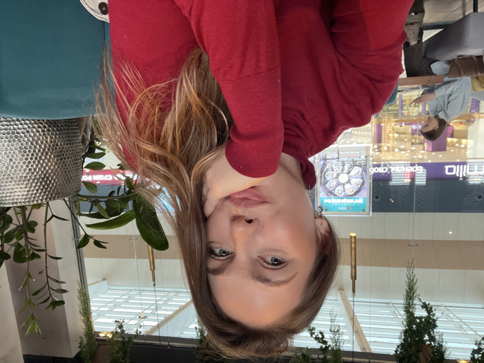 The image depicts an indoor scene within a cafe located in a shopping mall in Kommunarka, Russia. The primary subject, a female with light brown hair and blonde highlights, is positioned off-center to the right, wearing a red turtleneck sweater. Her left hand supports her chin, and her mouth is slightly pursed. A silver ring is visible on her left ring finger. In the mid-ground to the left, a second female is seated at a table, looking down at a smartphone held in both hands. She wears a light blue collared shirt. Behind both individuals, a large glass partition reveals the interior of a shopping mall, including multiple retail storefronts. Prominent signage includes "emilia" in purple lettering and Cyrillic text reading "БРЕНДЫ. СВОБО" (BRANDS. FREE). A lighted advertisement featuring oysters with Cyrillic text, likely "устрицы" (oysters), is also visible. Overhead, artificial hanging greenery and a minimalist cylindrical golden light fixture are present. To the right of the primary subject, a potted plant with green foliage sits in a textured metallic silver pot, adjacent to a teal upholstered seat. Through the background glass, an obscured sign with Cyrillic text "СУШИ РО" (SUSHI RO) is discernable.