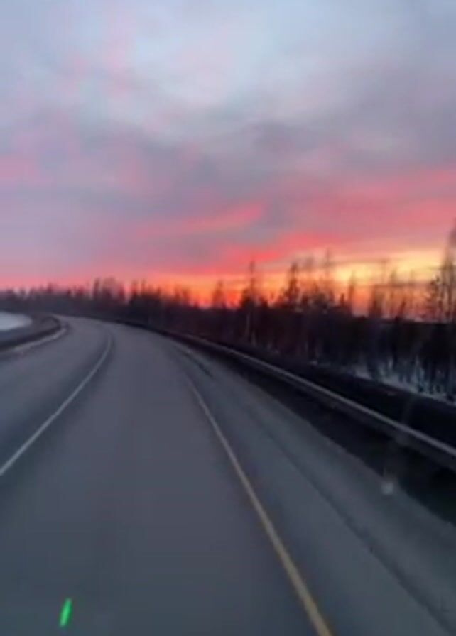 view from inside a vehicle, likely a car or truck, driving on a two-lane highway. The road curves gently, and a guardrail is visible on the right side. A line of trees borders the road, and patches of snow are visible on the left side. Above, the sky is filled with a vibrant sunset, featuring shades of pink, orange, and red against a greyish sky. The video appears to be taken at dawn or dusk, given the lighting conditions. There is an audio track with speech.
