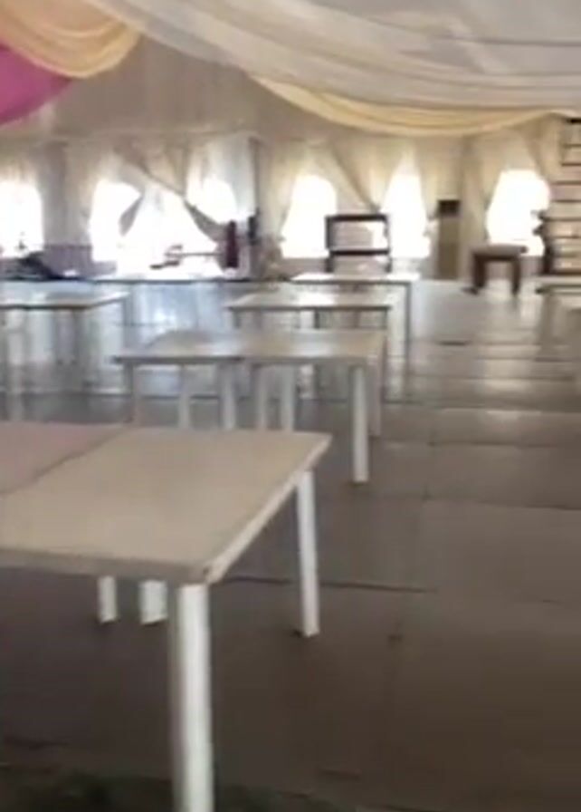 inside of a large tent or event space, appearing to be in the process of being set up or taken down. The floor is a dark, reflective surface, likely concrete or a similar material. Rows of small, square white tables are arranged throughout the space. Overhead, the tent is decorated with draped fabric in white, beige, and a vibrant pink or magenta color. There are windows around the perimeter of the tent, allowing natural light to enter. In the distance, glimpses of the outside environment are visible. Scaffolding and other equipment are also present, suggesting ongoing work. The overall impression is one of a large, empty space in transition.