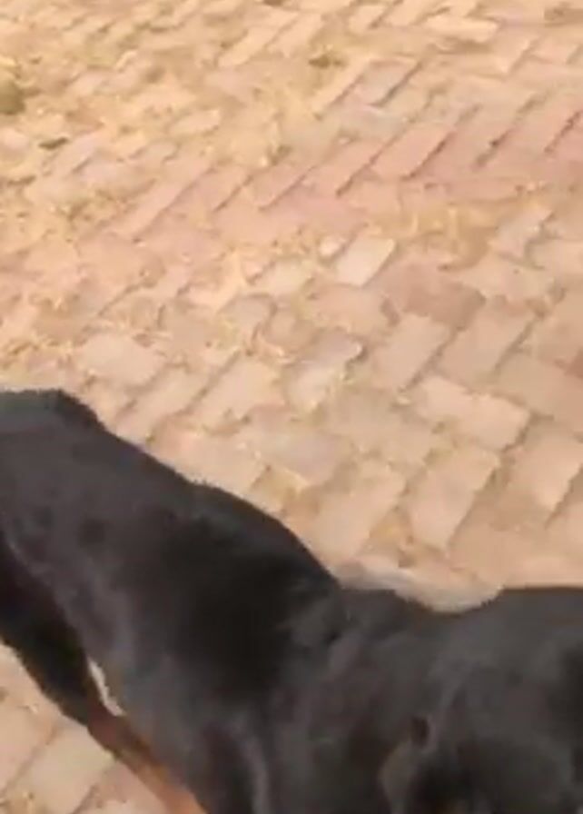 A short video shows a black dog, likely a Rottweiler, standing on a brick-paved area next to a parked black car