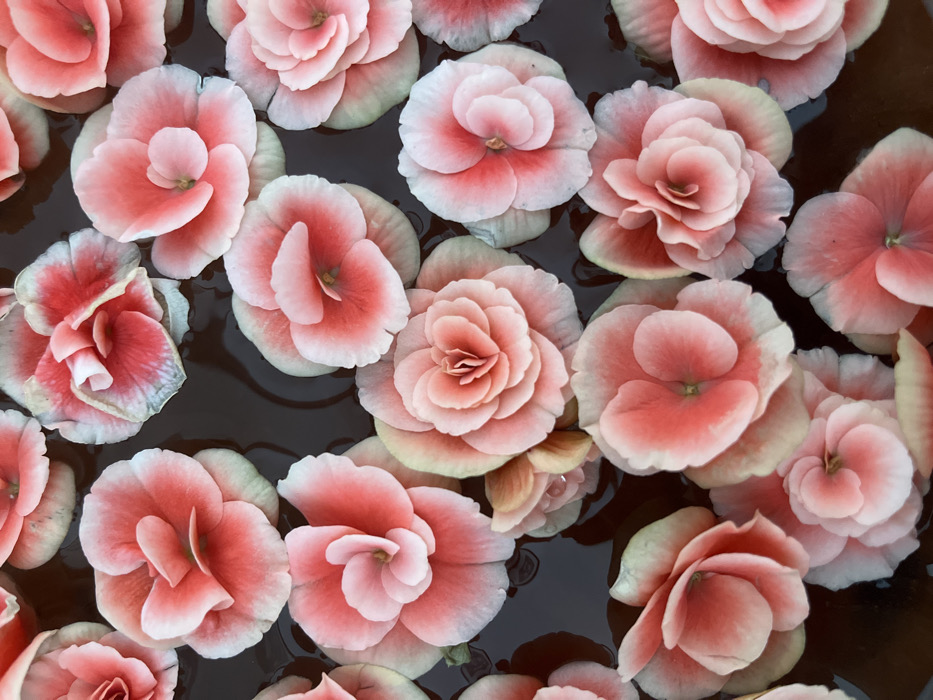 - "An overhead perspective displays a dense arrangement of numerous light pink and white Begonia flowers floating on a dark, reflective liquid surface" by FM-Y1BL73, licensed under CC BY 4.0