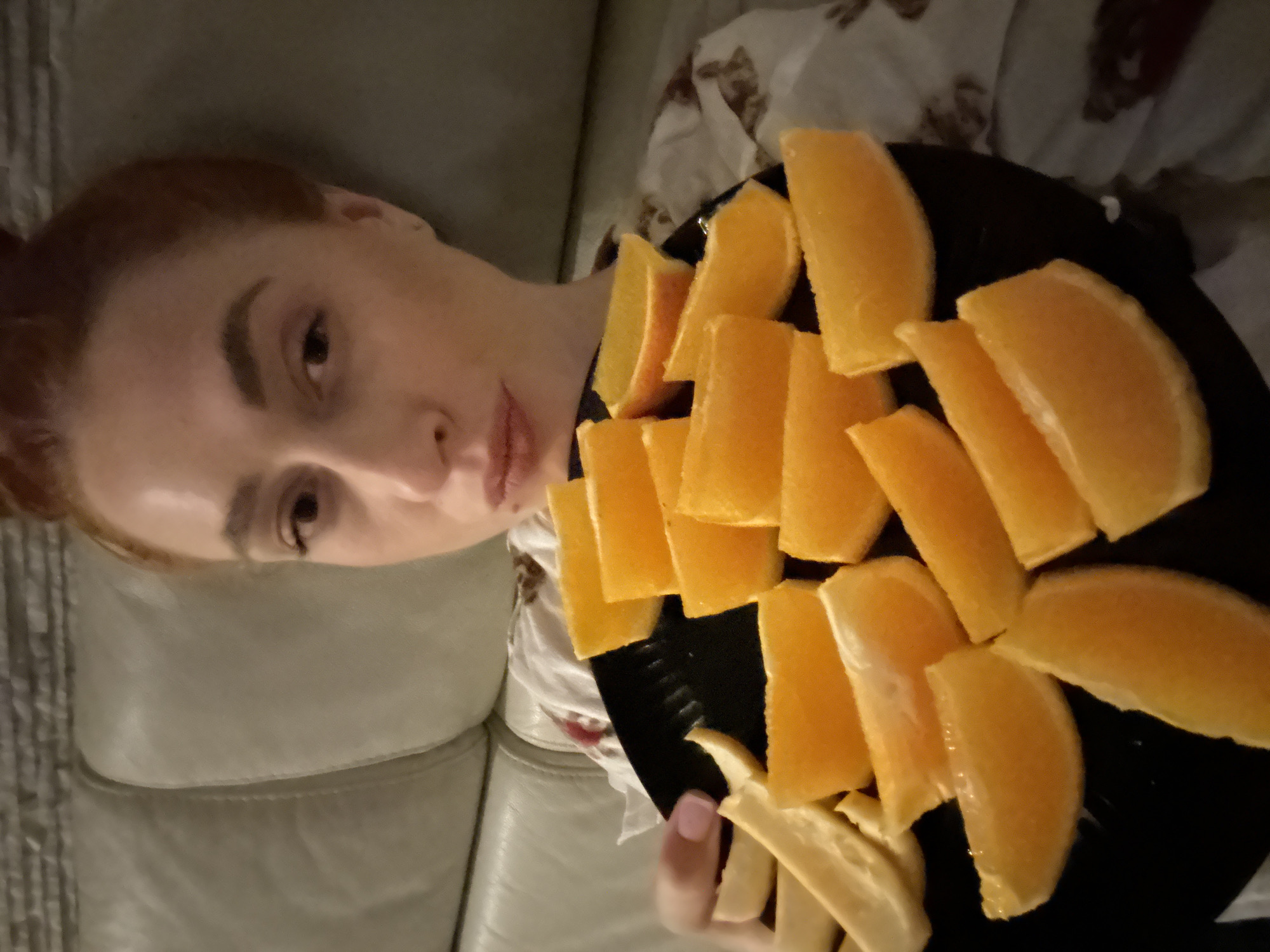 - "A woman with red hair is lying on a light-colored couch while holding a black plate piled with sliced oranges and what appears to be the white pith of the orange" by FM-tWRQa2, licensed under CC BY 4.0