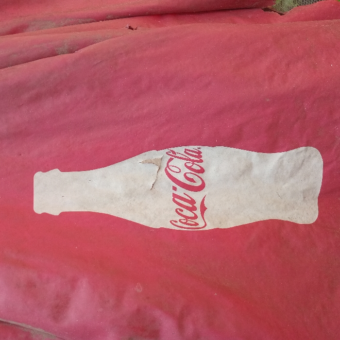 The image displays a weathered outdoor advertisement featuring a large, red background with a prominent white silhouette of a classic Coca-Cola contour bottle