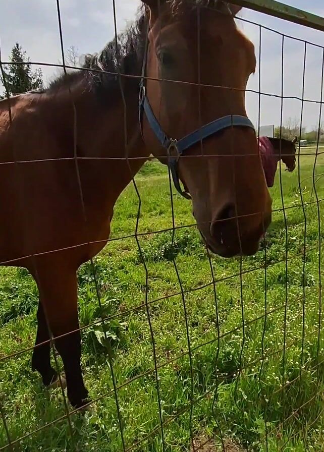 - "A brown horse wearing a blue halter stands behind a wire fence in a grassy field" by FM-nmJbp1, licensed under CC BY 4.0