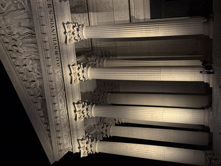 A low-angle shot features a building's facade dominated by large, fluted columns with ornate capitals. A frieze above the columns contains bas-relief sculptures and the inscription "D·O·M·S·V·B·INVOC·S·M". The columns are illuminated, creating a play of light and shadow. A few figures are visible on the right. The backdrop is dark, emphasizing the building's illuminated details. The structure exudes classical architectural style and grandeur.